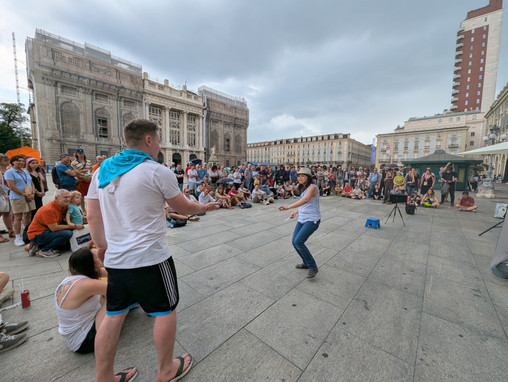 The competitors were split between two pitches: Piazza Castello and Piazza Carignano. Every 30 minutes, a show would start. When the show was over at 25 minutes, the judges (and a third of the audience) would walk over to the other piazza and watch the next show. So from 10:30am to 7:00pm (minus a lunch break), you could catch a street show every half hour.